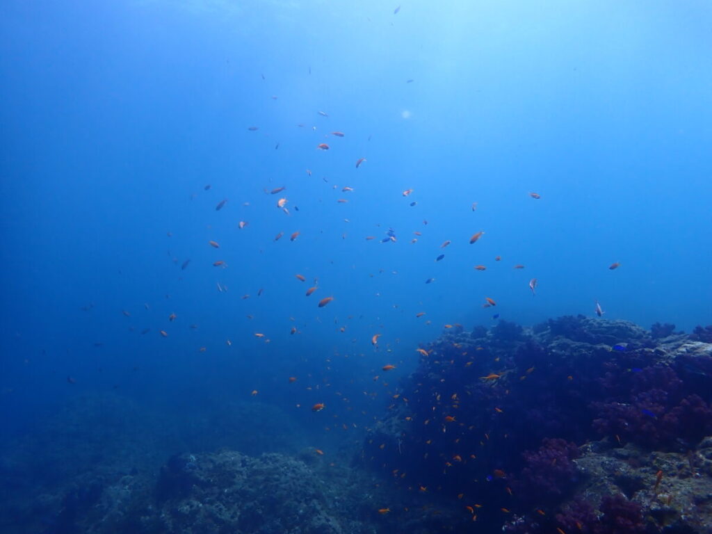 トンネルを抜けると丁度潮当たりの良い場所だったのでキンギョハナダイとコガネスズメダイがたくさん!