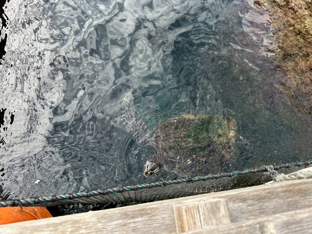 怪我してたカメを助けてあげたんだとか。治ったら海へ。