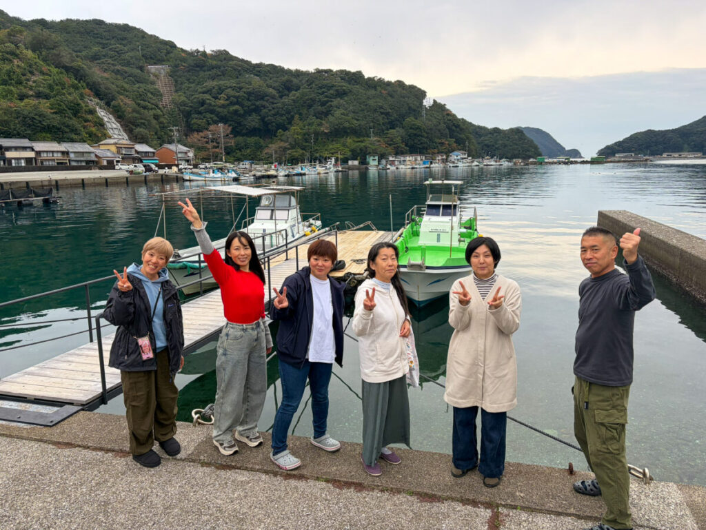 休憩中に超巨大カンパチが水揚げされてるのを見て女性陣が見に行ってる風景(笑)