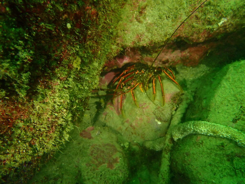ゴロタの隙間にはイセエビたくさん!
