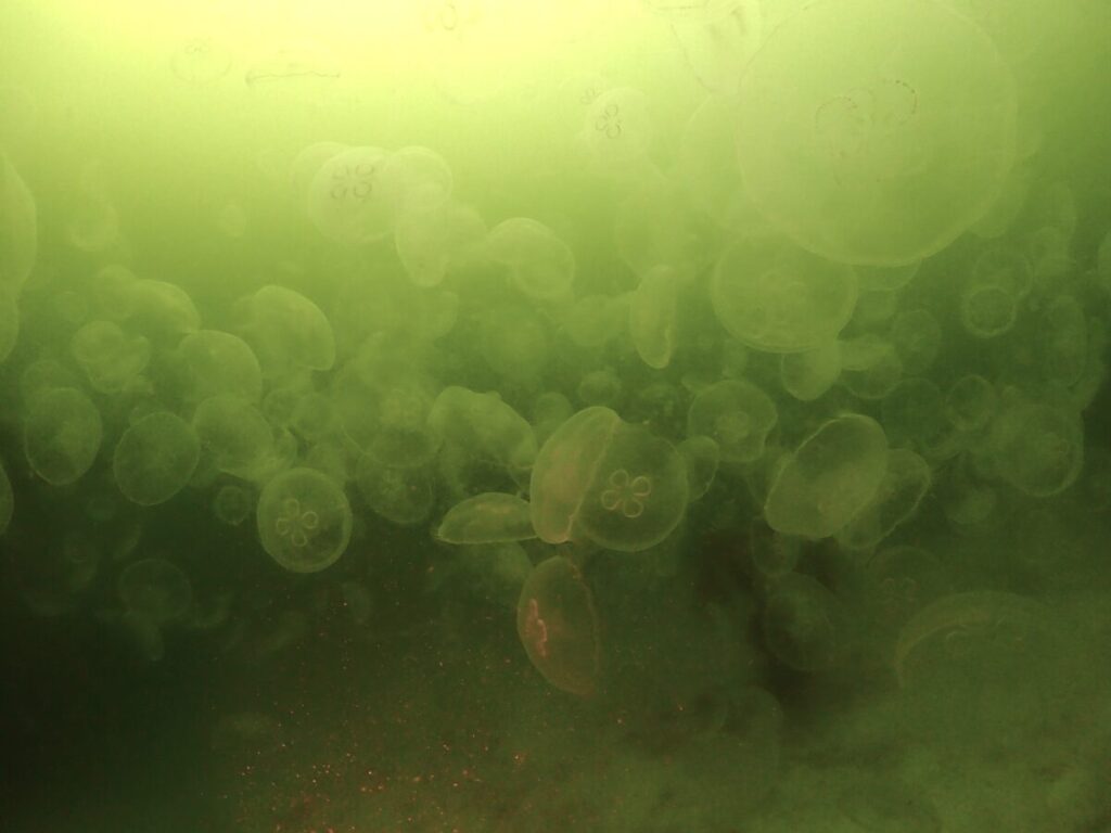 浅場に移動中砂地のところにミズクラゲたくさん!