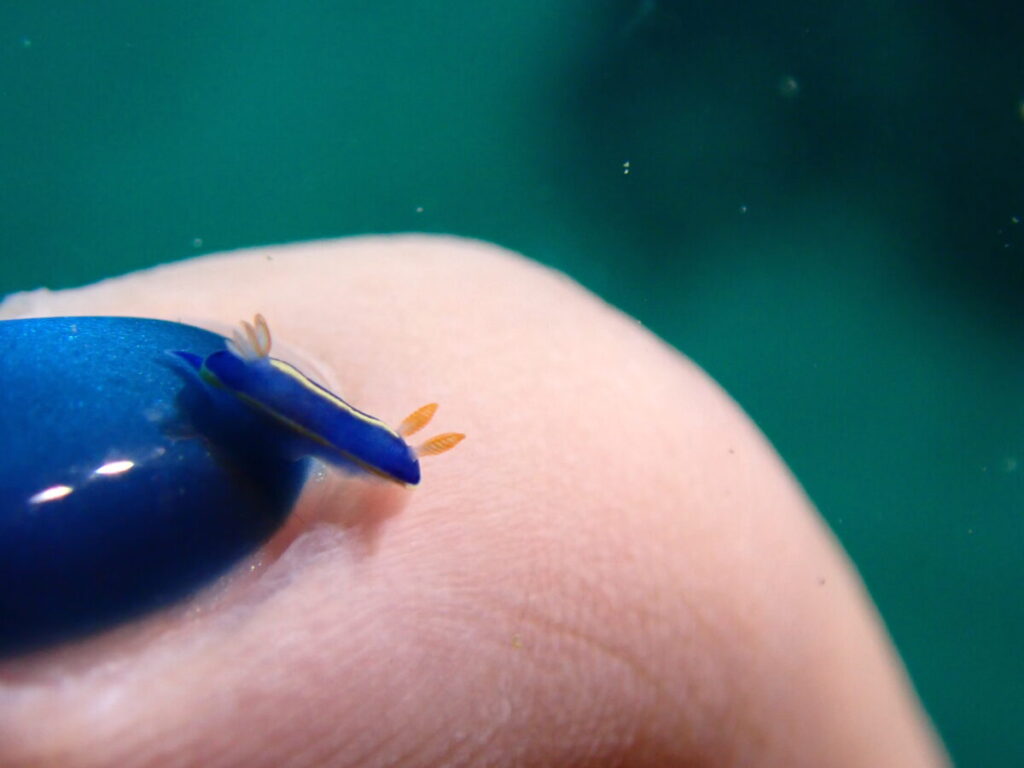 移動中にアオウミウシが飛んでて手に乗せたらネイルの色と全く同じでかわいくてパシャリ📸