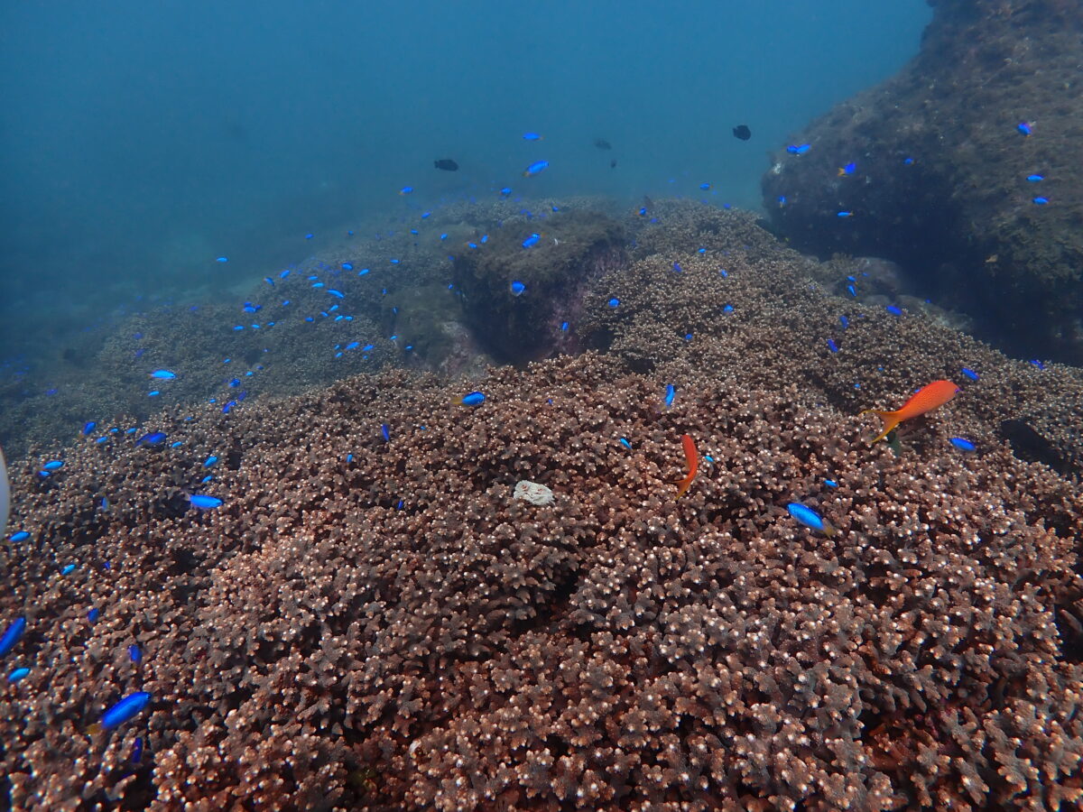 サンゴが群生しててそこにソラスズメダイやキンギョハナダイがワサワサしてました(^^)/